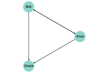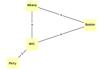 To most people a “graph" is a visual representation of data, like a bar chart or a plot of stock prices over time. That’s not what this chapter is about. In this chapter, a graph is a representation of a system that contains discrete, interconnected elements. The elements are represented by nodes — also called vertices – and the interconnections are represented by edges. For example, you could represent a road map with a node for each city and an edge for each road between cities. Or you could represent a social network using a node for each person, with an edge between two people if they are friends. In some graphs, edges have attributes like length, cost, or weight. For example, in a road map, the length of an edge might represent distance between cities or travel time. In a social network there might be different kinds of edges to represent different kinds of relationships: friends, business associates, etc. Edges may be directed or undirected, depending on whether the relationships they represent are asymmetric or symmetric. In a road map, you might represent a one-way street with a directed edge and a two-way street with an undirected edge. In some social networks, like Facebook, friendship is symmetric: if A is friends with B then B is friends with A. But on Twitter, for example, the “follows” relationship is not symmetric; if A follows B, that doesn’t imply that B follows A. So you might use undirected edges to represent a Facebook network and directed edges for Twitter. Graphs have interesting mathematical properties, and there is a branch of mathematics called graph theory that studies them. Graphs are also useful, because there are many real world problems that can be solved using graph algorithms. For example, Dijkstra’s shortest path algorithm is an efficient way to find the shortest path from a node to all other nodes in a graph. A path is a sequence of nodes with an edge between each consecutive pair. Graphs are usually drawn with squares or circles for nodes and lines for edges. For example, the directed graph in Figure ?? might represent three people who follow each other on Twitter. The arrow indicates the direction of the relationship. In this example, Alice and Bob follow each other, both follow Chuck, and Chuck follows no one. The undirected graph in Figure ?? shows four cities in the northeast United States; the labels on the edges indicate driving time in hours. In this example the placement of the nodes corresponds roughly to the geography of the cities, but in general the layout of a graph is arbitrary. 2.2 NetworkX