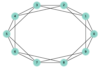 A regular graph is a graph where each node has the same number of neighbors; the number of neighbors is also called the degree of the node. A ring lattice is a kind of regular graph, which Watts and Strogatz use as the basis of their model. In a ring lattice with n nodes, the nodes can be arranged in a circle with each node connected to the k nearest neighbors. For example, a ring lattice with n=3 and k=2 would contain the following edges: (0, 1), (1, 2), and (2, 0). Notice that the edges “wrap around” from the highest-numbered node back to 0. More generally, we can enumerate the edges like this: