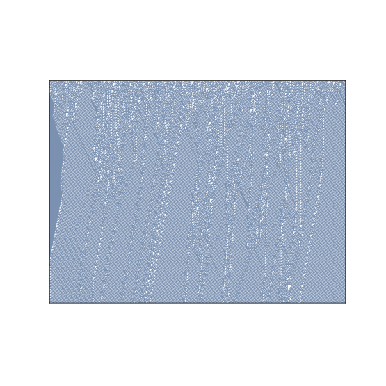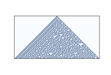 Class 3 contains CAs that generate randomness. Rule 30 is an example; Figure ?? shows what it looks like after 100 time steps. Along the left side there is an apparent pattern, and on the right side there are triangles in various sizes, but the center seems quite random. In fact, if you take the center column and treat it as a sequence of bits, it is hard to distinguish from a truly random sequence. It passes many of the statistical tests people use to test whether a sequence of bits is random. Programs that produce random-seeming numbers are called pseudo-random number generators (PRNGs). They are not considered truly random because: