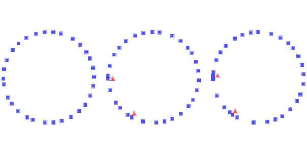 | Figure 10.1: Simulation of drivers on a circular highway at three points in time. Squares indicate the position of the drivers; triangles indicate places where one driver has to brake to avoid another. |