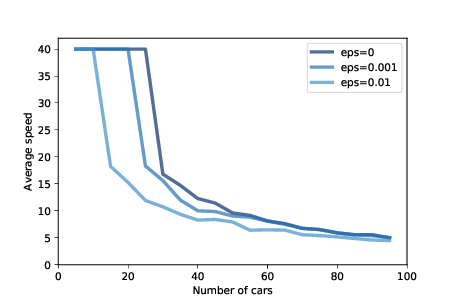 | Figure 10.2: Average speed as a function of the number of cars, for three magnitudes of added random noise. |