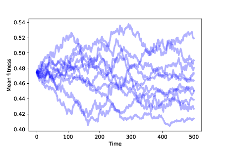 Figure ?? shows the result of running this simulation 10 times. The mean fitness of the population drifts up or down at random. Since the distribution of fitness changes over time, we infer that the distribution of phenotypes is also changing. By the most inclusive definition, this random walk is a kind of evolution. But it is not a particularly interesting kind. In particular, this kind of evolution does not explain how biological species change over time, or how new species appear. The theory of evolution is powerful because it explains phenomena we see in the natural world that seem inexplicable:
