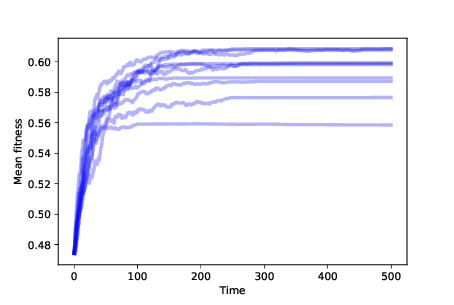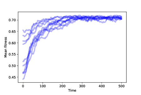 Figure ?? shows the results of 10 simulations with mutation and differential survival and reproduction. In every case, the population evolves toward the location with maximum fitness.