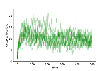 When we change the landscape as in Section ??, the number of occupied locations and the mean distance usually increase, but the effect is not always big enough to be obvious. Try out some different random seeds to see how general the effect is.
