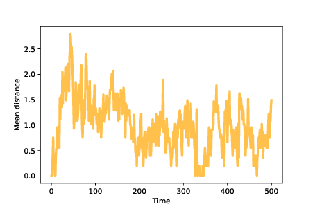 The To quantify the dispersion of a population, we can compute the mean of the distances between pairs of agents. In the notebook for this chapter, you’ll see the Figure ?? shows mean distance between agents over time. Because we start with identical mutants, the initial distances are 0. As mutations occur, mean distance increases, reaching a maximum while the population migrates across the landscape. Once the agents discover the optimal location, mean distance decreases until the population reaches an equilibrium where increasing distance due to mutation is balanced by decreasing distance as agents far from the optimal location disappear. In these simulations, the mean distance in equilibrium is near 1; that is, most agents are only one mutation away from optimal. Now we are ready to look for new species. To model a simple kind of speciation, suppose a population evolves in an unchanging environment until it reaches steady state (like some species we find in nature that seem to have changed very little over long periods of time). Now suppose we either change the environment or transport the population to a new environment. Some features that increased fitness in the old environment might decrease it in the new environment, and vice versa. We can model these scenarios by running a simulation until the population reaches steady state, then changing the fitness landscape, and then resuming the simulation until the population reaches steady state again.
