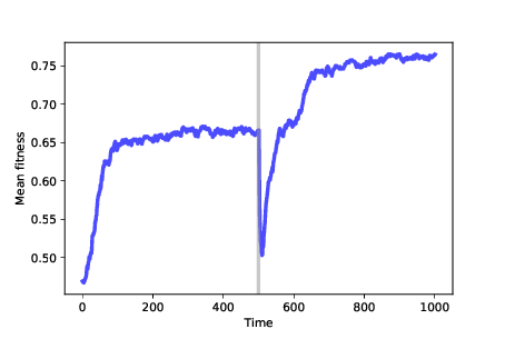 Figure ?? shows results from a simulation like that. We start with 100 identical mutants at a random location, and run the simulation for 500 time steps. At that point, many agents are at the optimal location, which has fitness near 0.65 in this example. The genotypes of the agents form a cluster, with the mean distance between agents near 1. After 500 steps, we run After the change, mean fitness increases again as the population migrates across the new landscape, eventually finding the new optimum, which has fitness near 0.75 (which happens to be higher in this example, but needn’t be). Once the population reaches steady state, it forms a new cluster, with mean distance between agents near 1 again. Now if we compute the distance between the agents’ locations before and after the change, they differ by more than 6, on average. The distances between clusters are much bigger than the distances between agents in each cluster, so we can interpret these clusters as distinct species. 11.10 SummaryWe have seen that mutation, along with differential survival and reproduction, is sufficient to cause increasing fitness, increasing diversity, and a simple form of speciation. This model is not meant to be realistic; evolution in natural systems is much more complicated than this. Rather, it is meant to be a “sufficiency theorem"; that is, a demonstration that the features of the model are sufficient to produce the behavior we are trying to explain (see http://thinkcomplex.com/suff). Logically, this “theorem" doesn’t prove that evolution in nature is caused by these mechanisms alone. But since these mechanisms do appear, in many forms, in biological systems, it is reasonable to think that they at least contribute to natural evolution. Likewise, the model does not prove that these mechanisms always cause evolution. But the results we see here turn out to be robust: in almost any model that includes these features — imperfect replicators, variability, and differential reproduction — evolution happens. I hope this observation helps to demystify evolution. When we look at natural systems, evolution seems complicated. And because we primarily see the results of evolution, with only glimpses of the process, it can be hard to imagine and hard to believe. But in simulation, we see the whole process, not just the results. And by including the minimal set of features to produce evolution — temporarily ignoring the vast complexity of biological life — we can see evolution as the surprisingly simple, inevitable idea that it is. 11.11 ExercisesThe code for this chapter is in the Jupyter notebook chap11.ipynb in the repository for this book. Open the notebook, read the code, and run the cells. You can use the notebook to work on the following exercises. My solutions are in chap11soln.ipynb. Exercise 1 The notebook shows the effects of differential reproductions and survival separately. What if you have both? Write a class called As a Python challenge, can you write this class without copying code? Exercise 2