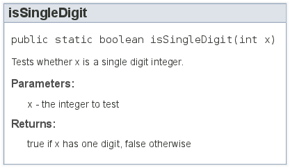 | /** * Tests whether x is a single digit integer. * * @param x the integer to test * @return true if x has one digit, false otherwise */ public static boolean isSingleDigit(int x) { |