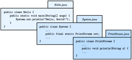 As shown in Figure 3.1, System is defined in a file called System.java, and PrintStream is defined in PrintStream.java.