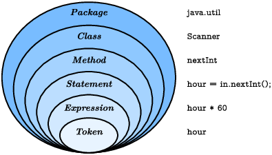 Knowing this terminology is helpful, because error messages often say things like “not a statement” or “illegal start of expression” or “unexpected token”. Comparing Java to English, statements are complete sentences, expressions are phrases, and tokens are individual words and punctuation marks.