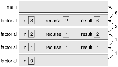 Since 3 is not 0, we skip the first branch and calculate the factorial of n−1...Since 2 is not 0, we skip the first branch and calculate the factorial of n−1...The return value (2) gets multiplied bySince 1 is not 0, we skip the first branch and calculate the factorial of n−1...The return value (1) gets multiplied bySince 0 is 0, we take the first branch and return the value 1 immediately.The return value (1) gets multiplied byn, which is 1, and the result is returned.n, which is 2, and the result is returned.n, which is 3, and the result, 6, is returned to whatever invokedfactorial(3).