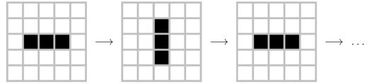 During the next time step, the center cell lives, the top and bottom cells die, and the left and right cells come to life. The result is three horizontal cells, so we’re back where we started, and the cycle repeats forever.